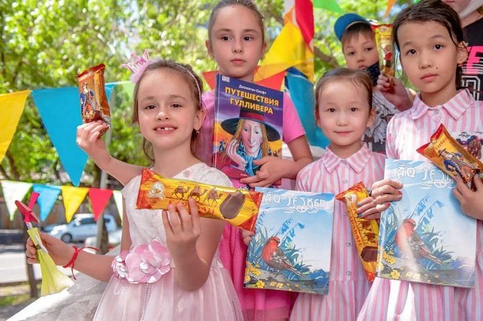 Совместно с Центральной городской детской библиотекой Алматы им. С. Бегалина мы постарались подарить детям путешествие в сказку. В этом году ребята впервые попробовали новые вкусы нашего мороженого, а дети детских домов получили в подарок от компании еще и книги, которые с любовью подобраны специалистами библиотеки и перекликаются с конфетной серией мороженого «Золотая коллекция», — рассказал Владимир Пак, генеральный директор компании «Шин-Лайн».