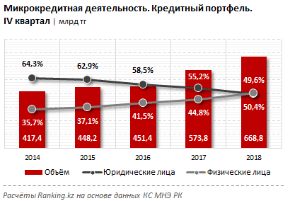 Совокупный кредитный портфель МКО и кредитных товариществ на конец 2018 года составляет 668,8 млрд тг — на 16,6% больше, чем годом ранее.